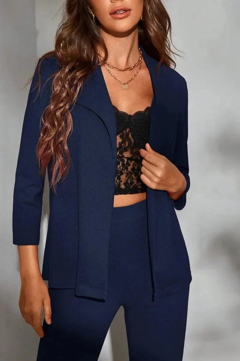 Mathilde | Sæt redefinerer professionel elegance med en moderne tilgang. Den lange asymmetriske overdel bærer subtile lynlådsdetaljer, der bevarer en skarp silhuet, mens matchende slimbukser følger kroppen uden at hæmme bevægelse. I en dyb marineblå nuance kombinerer sættet letvægtskvalitet med fremragende drapering og komfort i kølige sæsoner. Håndværket kommer til udtryk i hver søm og detalje, hvilket sikrer lang levetid og arvbar kvalitet. Tilgængeligheden er begrænset i udvalgte kollektioner—Mathilde | Sæt bærer dermed en ægte samlerappel og en tidløs værdi for klædeskabet.